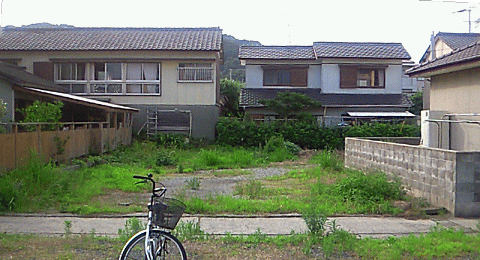 | 8 熊本県天草郡富岡(森競宅) 1932(昭7)20歳 〔注・兄の森競の住まいは、父祖の原籍。森敦もこの原籍に出生届が出された。屋敷の土地面積は、約900坪。写真は、原籍の屋敷跡で、手前の空き地を含め、10軒ほどの家が建ち並んでいる〕 |