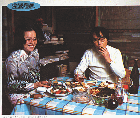 | 開口一番、「ぼくはまったく食わんのですよ」「いつもはこんなに気取ったものなんか食ってないですからね」と、森氏に念を押されて撮影したのがこの料理。 ひどい偏食のそのまた上にひどい凝り性がつく森氏としては、この食卓も、本当はいま凝っている板わかめと岩のりと焼きこんぶだけにしてほしかったらしく、はなはだ不本意そうに最初から最後まで、娘の富子さんに文句のつけっぱなしだった。 氏の朝食、昼食もこれまた数年間凝っているお手製の、牛乳と卵と砂糖のミルクセーキ一本やり。だから夕食も、好きな酒と海草類さえあればいうことなし、という次第。 今晩も、チョッピリ料理にはしをつけ、海草とビールとウイスキーの水割りで心ゆくまでのどを潤し、あとはバッタリ、一日が終わる。 献立=てんぷら(かぼちゃ、なす)、もりつけ(岩のり、板わかめ、焼きこんぶ、ポテトチップ、ぎんなん)酢ぶた風あんかけ、菜の花のからし和え、かずのこの二杯酢かけ、おにぎり |