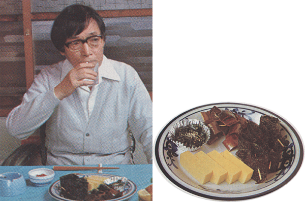 | ぼくは酒は十時から飲むようにしている。それ以前に飲むのは、だらしないと思うようになったんだ。昔は朝から飲んでいたけどね。さかなはほとんど海草類。野菜もあまり食べんから、緑のものは海草だけみたいなもんだ。若布の根っこなんかうまいな。 写真の海草は岩海苔にゴマ油を塗って焼き、塩とゴマをかけて楊子にさしたもの。これは焼たてよりちょっとおいたほうがうまい。それから昆布を切って油でカラ揚げしたもの、銀紙の海草は、春菊か小松菜、なければ大根の葉でもいいが、これを茹でて細かく切る。ふきんで水気を切ってから三十分ほど妙って七味唐がらし、塩、味の素、白ゴマ、海苔をいっしょにした一種のふりかけみたいなもんだ。黄色いのはカボチャを裏ごししてホワイトソースの中にいれて固めたもの。カボチャの西洋風羊かんかな? これは全部娘の富子が考えて作ったんだ。海草類が好きなのも、月山に十年ほどこもっていたせいじゃないかなあ。手を入れた料理はあまり好きじゃない。檀一雄が料理を作ってくれたが、あれだけは食えなかった。ありゃあ、かなわん。(談) |