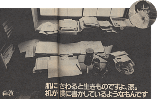 | NHKで、木曽路を撮るというので、それで僕は行ったんですわ、木曽路に。その時漆も撮りたかったわけですよ、どうでも。で、城取邦夫という人の作った漆を写したんですわ。その時にね、僕にお椀をくれた。それがなかなか綺麗なお椀で、その綺麗なお椀を、僕は、外に出て、お椀をもたげるようにして見たわけです。そうしたら、冬枯れていたんですけども、その冬枯れで真っ青に、空が晴れておった。真っ青に晴れていたんで、そのお椀の中に、空が映ったんですね。だからこのお椀の中に木曽路の空が全部入ってた。そういうことを僕が書いたんです、そのお椀の話を。そしたら城取さんが喜んで、そういってくれるのはありがたいというんで、そのお椀をたくさん作りまして、「蒼穹」という題をつけまして、売っとるんです。まあ、そういうことから、城取さんと仲良くなったんですね。ずいぶんもう、城取さんとのつき合いも長いです、六、七年になるかな、もっと前かもしれない。この机は、その城取邦夫さんの作品です。 城取さんの話だと、荒っぽく使ってくれっていうんですよ。どんどん、ごしごし拭いてもいいし、荒っぽく使ってくれと。僕はほら、茶托もなく、こうやって飲んでいるんですよね。でもあとで拭くと、またこういうふうに綺麗になっちゃう。 机が書かしてるようなもんです。僕は机が合わんと、あまり書けん方です。この漆っていうものは、割合いに夏は、ひやっとして涼しいんです。そして冬は、案外あったかいんです。だから可愛いですよ、ええ。夏涼しくて、冬あったかい。非常に親しみがあるんです。使ってると、本当に肌さわってみると、生き物ですね。漆ですから。 僕は各地に住んでいましたから、その土地にあるものを、勝手に使わしてもらったりしておりましたけれども、自分の家では、ちゃんとした机を使ってたんです。樅の木かなんかの一枚板のものをね、持って歩いていたですね。折り畳のお膳みたいになってて。 もうこの机で満足してます。特に装飾してないわけです。これ古代木目っていうんだそうですがね。紅い机もありましたし、青い机もありました。だけども、いろんな色がついていると、かえって書きにくい。そっちの方に気をとられる。というようなことで、僕はこういう平凡な方がいい。 城取さんが、まず真中の机を作ってくれたんです。僕、原稿をぞろっとこう、並べる癖がありましてね。これじゃ実は僕には狭いんで、もうちょっと広いものが欲しいと思ったんです。そうしたら一枚板で広くするよりは、こういうふうにした方がというんで、小さいやつをこういうふうに二つ付けて、ワンセットにしたんです。 城取さんという人はね、自分で工芸家とはいわないんです、漆工といっている工芸家なんですよ、本当はね。 友達が来て、皆欲しいらしいんですよ。作家の友達はこういう机欲しがってる。いくらで買えるか、と聞かれるんですよ。わからんから電話かけて訊いてみると、値段はわからんそうです。 だんだん漆が好きになって、いろんなものを漆にしようと考えてます。城取さんが作られたお椀やなんか、たくさん使ってます。木曽の平沢から送ってもらってるんです。 |
