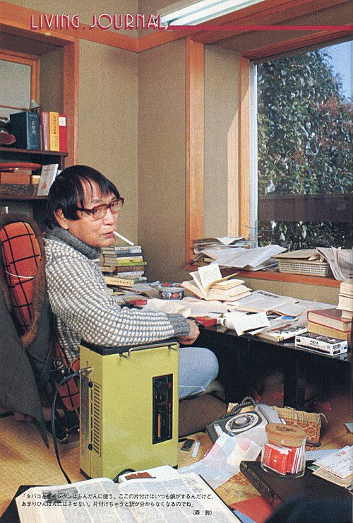 | 「あれ(『月山』)は山手線の電車の中で書いたけど、男として、主人として、書斎は絶対に必要だね。別にどこでも作品は書けると思うけど、寝室が体とすると書斎は頭だからね、大事なものなんだ。人間というのは環境によってモノの考え方が違ってくる。ここに入ると、書こうと、そういう気持ちになるんだ。部屋の中としては音がしない、うるさくないこと、それにあまり広くないほうがいい。気分が集中しないから。ただし、机は大きいほうがいいよ。今、三つの座卓を組み合わせた広いヤツを使っている。これは便利だね。この部屋にいるのは大体四時間くらい。僕は朝四時から八時まで電車に乗ってあれを書いた。本気になってがんばれる時間は四時間くらいが限度だよ。え? ここでは寝ない。そのために寝室があるんだから」(森敦、『月山』で四十九年に受賞) |