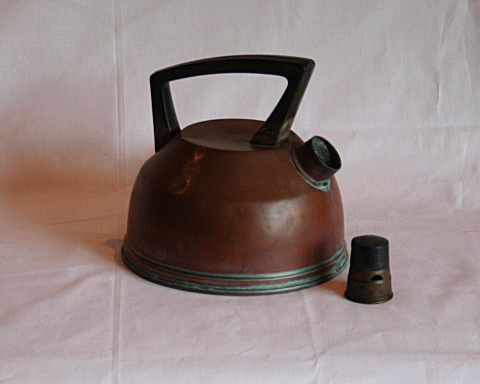 | 底部にBUDEN REIN KUPEER(純銅製)Thekla社とある。昭和52年(1977)ころ購入。12年間にわたり愛用。沸騰すると笛が猛烈に鳴るが、笛に気づかないほど執筆に集中し何度も空焚きをした。 取っ手が焦げていても、ぐらついていない。好きな紅茶を入れるために、日に何度も湯を沸かして小さな魔法瓶に移して使用した。火災を案じ電気ポット使用を勧めても、紅茶がまずくなると言って受け入れなかった。 空焚きで出火しなかったのは奇跡である。 |