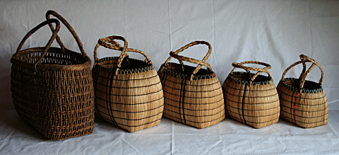 | がま、みご(わらの芯)、山葡萄の皮、あけびの蔓を材料に編んだもので、注連寺に行くたびに七五三掛のばさまたちから、土産にもらったもの。注連寺に滞在した人々は「また来る」と言って去っても再訪した人はなく、「森さんだけは、本当にまた来てくれたのう」と喜んだ。 てんごにはばさまたちの喜びが詰まっている。 |