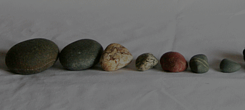 | グリ石を手もとに置いて眺めていた。次のように作品に描いた。 〈グリ石は川原(注・北山川)に溢れているだけではありません。川原の向こうの山にかけて散在する民家も、グリ石で道をつくり、石垣をつくり、杉皮葺きの屋根にグリ石を置いている。まるで、グリ石が山にまではい上ろうとしているようです。〉(「天上の眺め」) 〈わたしは名勝瀞八丁で知られた北山川で働いたことがある。(略)洪水が起こるたびに、川岸は一面、荒涼たる玉石の川原になる。そのようにして、すべての石は押し流されて来、押し流されて行くかに思えるが、必ずしもすべてがそうではない。中には、みずからを守って、いかなることにも動じない、中流の砥柱ともいうべきものがある。/そういう石には洪水も、僅かに上流側の土砂を抉り取るしかない。したがって、石は上流側に転がり、押し流されるどころか、溯って来るのである。〉(「中流の砥柱」) |