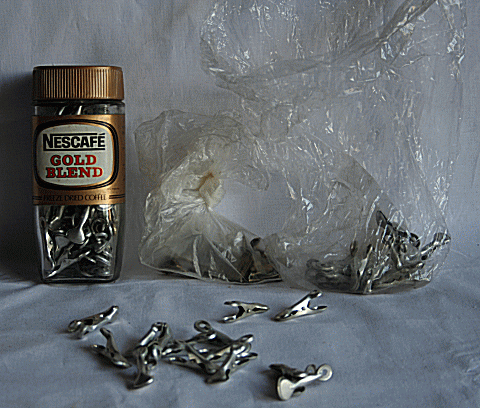 | ガリ版で刷った紙を、天井に張り巡らした紐にぶら下げるために、洗濯バサミを使った。大量にあったが、その一部が残っている。 小島信夫さんも書いている。〈森さんは「実現」というガリ版誌を刷って、……訪ねると部屋の中に張った糸に刷った紙が洗濯バサミではさんで吊るしてあった。〉(『小島信夫全集1』) |