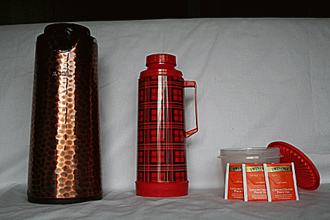 | 真ん中の赤い格子縞のアラジンの魔法瓶が森敦愛用で、左の魔法瓶は客が来たときに使った。 頻繁に紅茶を飲むため、日に何度も笛吹きやかんでお湯を沸かして魔法瓶に注いで使った。電気ポットが出始めたころ、安全で便利な電気ポットに切り替えようと説得しても応じず、アラジンの魔法瓶に固執して使い続けた。 右は、ティーパックを入れた容器。紅茶中毒者で、絶対にトワイニングのオレンジペコでなければならなかった。紅茶とアスピリンで執筆した作家だ。一日に二十袋くらいを飲むので、業務用のダンボールに入ったティーパックを買いこんで書斎に置いた。 |