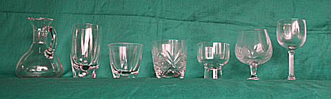 | 左から二つ目と三つ目が、特にこだわったグラス。前者は麦酒用、後者はウイスキー用。カットグラスと言って、一つン千円もして、割れやすい。はれものに触るように扱っても、安物は長持ちするのに高級品ほど壊れてしまう。私は割れたコップの破片を見て、ン千万円が屑になったと思うのだが、森敦は悠然として「ガラスや瀬戸物は割れるもだ」と言った。 |